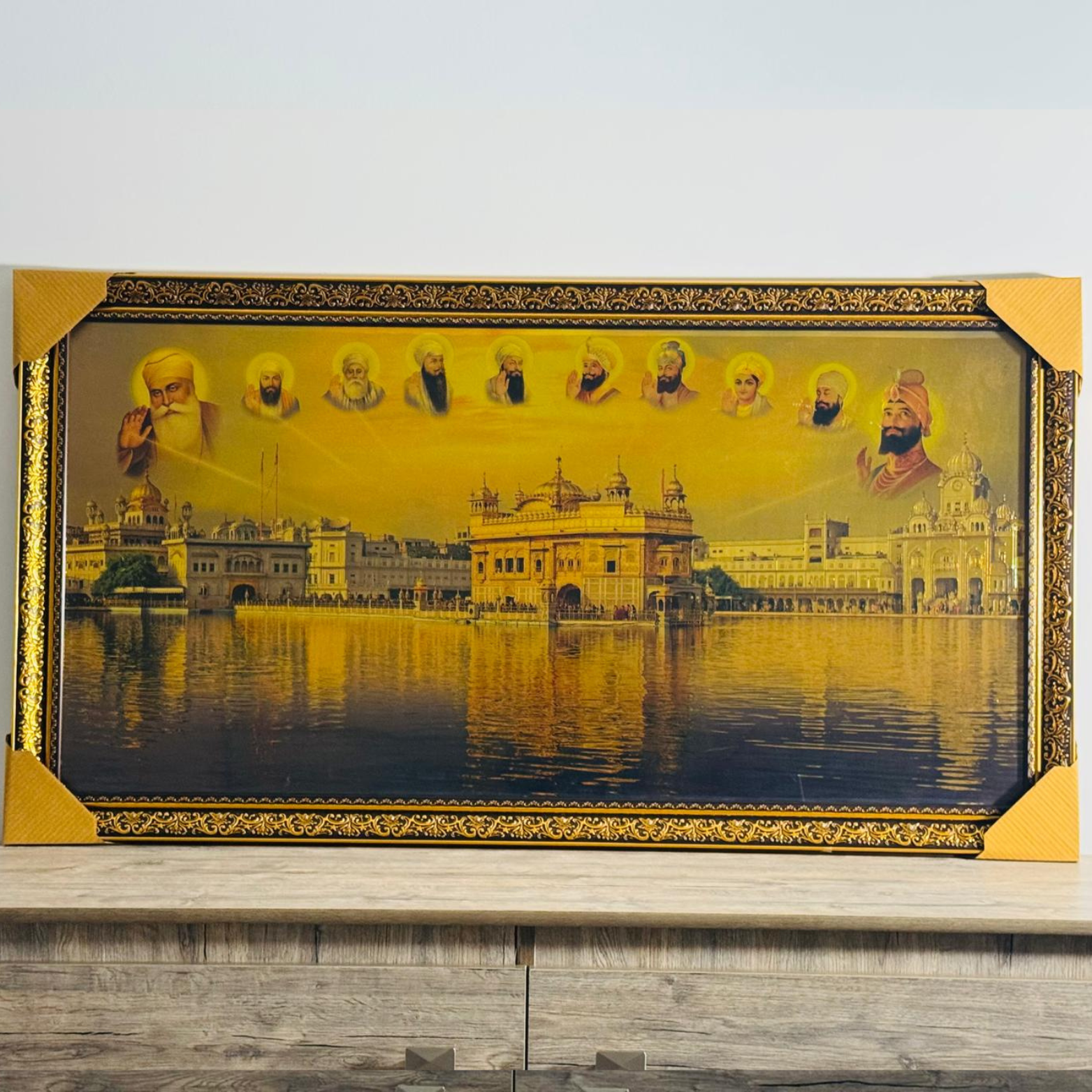 This beautifully crafted framed artwork showcases the serene Golden Temple surrounded by portraits of the Sikh Gurus, symbolizing faith, peace, and spiritual heritage. Finished in rich golden tones with an elegant decorative border, it adds a divine and graceful touch to any home, office, or prayer space. A perfect piece for devotion, décor, or gifting.
