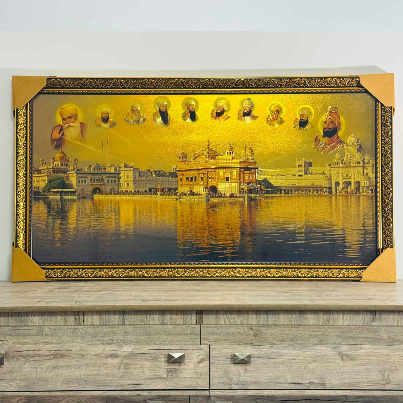 This exquisite wall frame portrays the sacred Golden Temple illuminated in golden hues, with the revered Sikh Gurus gracefully depicted above, symbolizing faith, unity, and divine blessings. Crafted with an ornate decorative border, it adds a touch of spirituality and elegance to any home, office, or prayer space. An ideal devotional décor piece and a meaningful gift for special occasions.