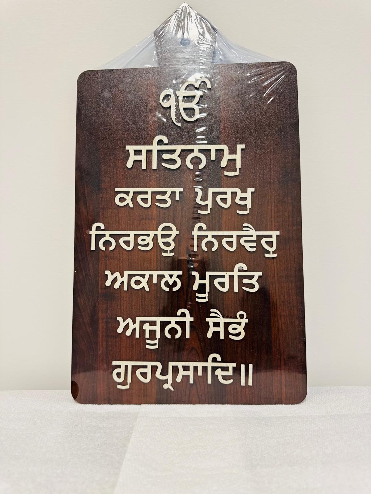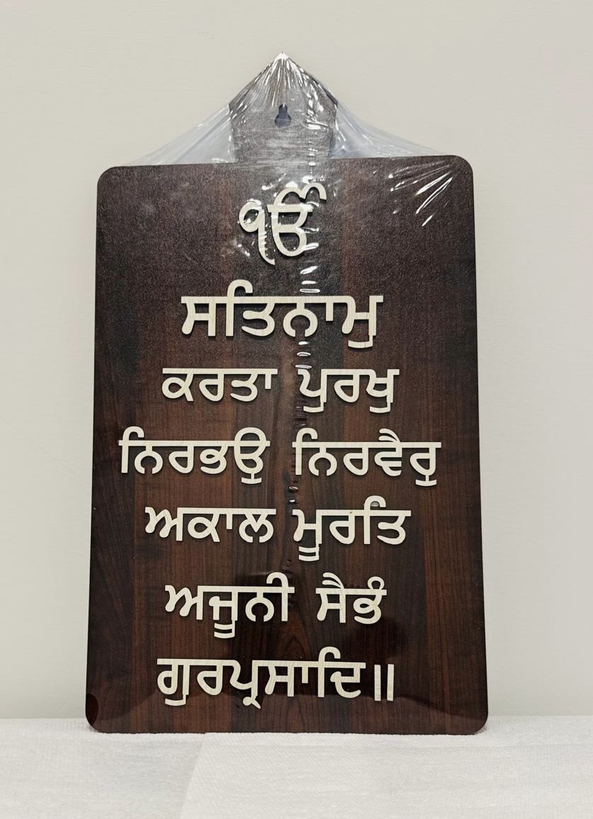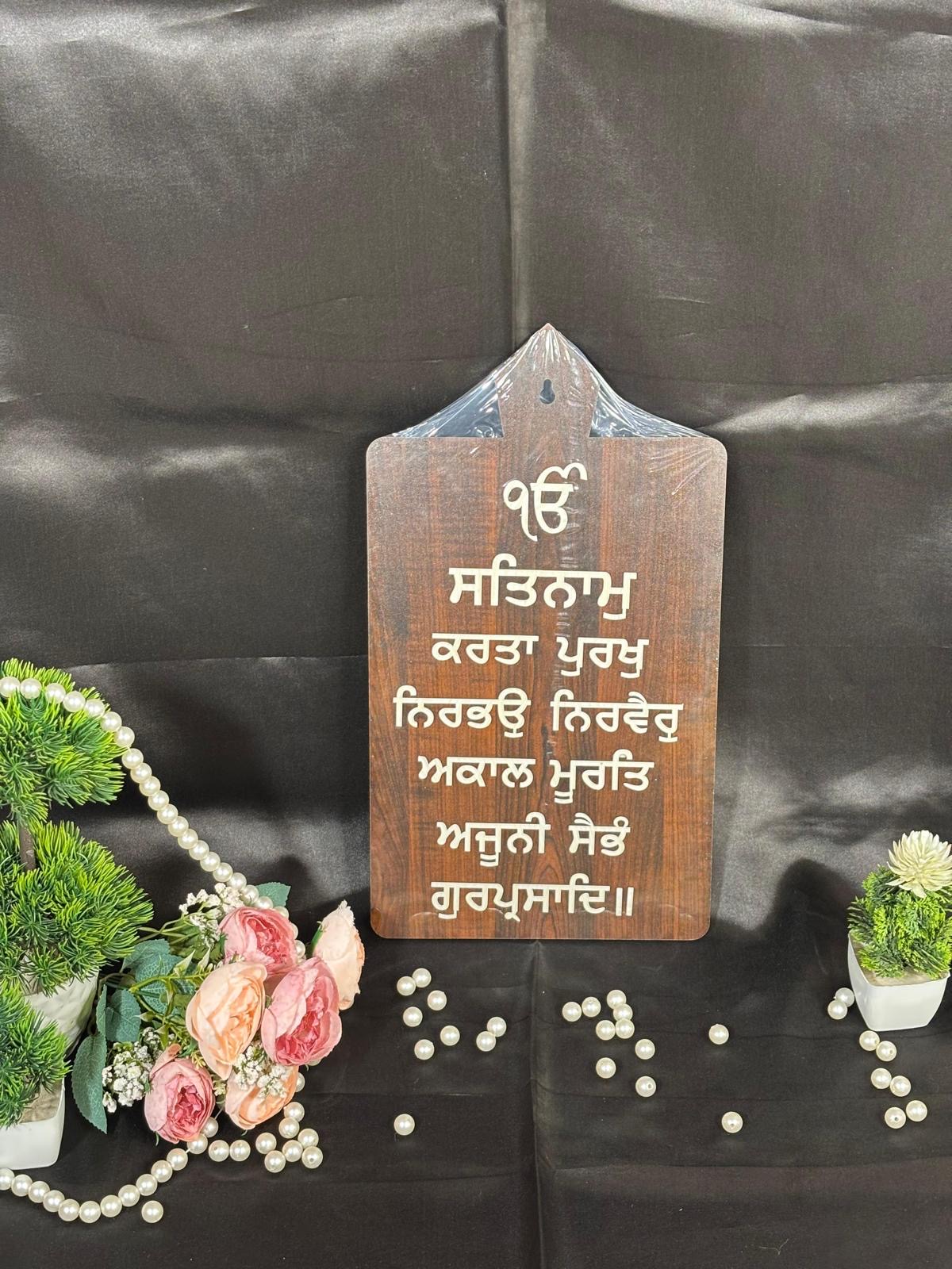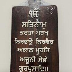 This wooden wall hanging features a beautifully engraved Mool Mantar in Punjabi, adding a touch of spirituality and elegance to your space. Crafted from high-quality wood with a rich finish, it serves as a meaningful décor piece for your home and office. A perfect gift for your loved ones, this plaque inspires positivity and devotion in daily life.