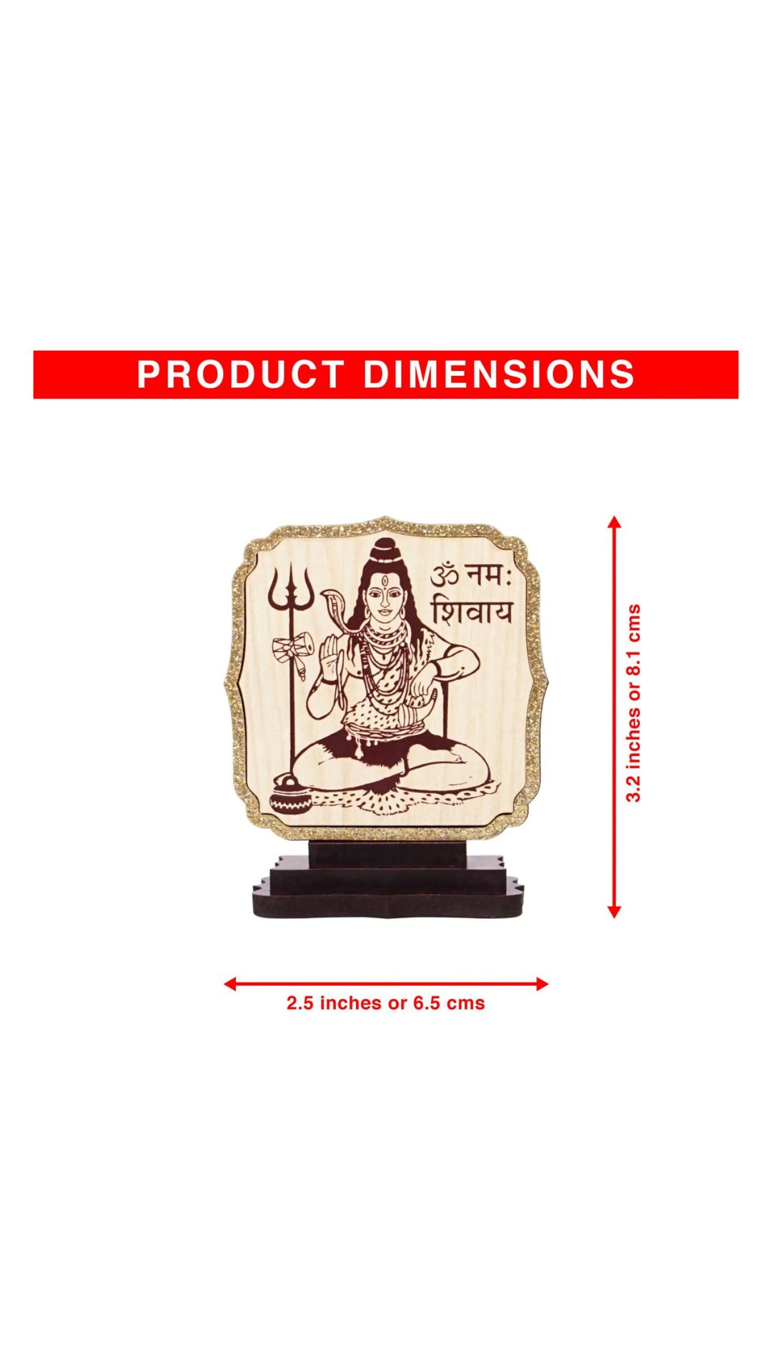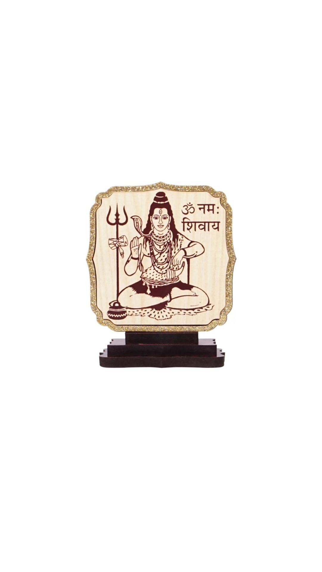 Bring spiritual energy and divine blessings into your space with this elegant wooden table piece of Lord Shiva. Expertly engraved with fine detailing and framed with a golden border, it features the sacred mantra “ॐ नमः शिवाय” and depicts Mahadev in a meditative pose, holding a trishul (trident).